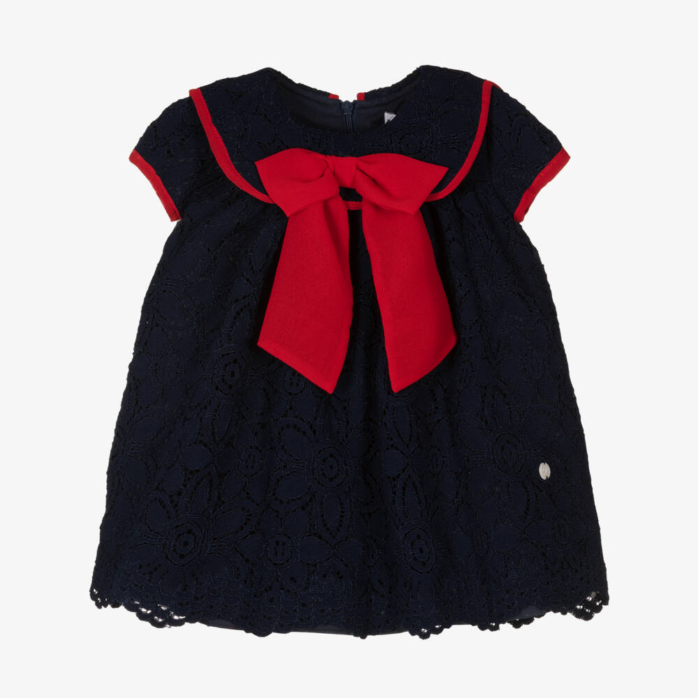 Navy blue dress for little girls by Portuguese brand Patachou, made in beautifully soft cotton lace. It has a bib collar with deep red trims and a chiffon bow appliqué for a romantic, classical look. For comfort, it is lined in layers of soft and lightweight cotton. There is a pearlescent charm logo on the front, and a concealed zip fastening on the back.