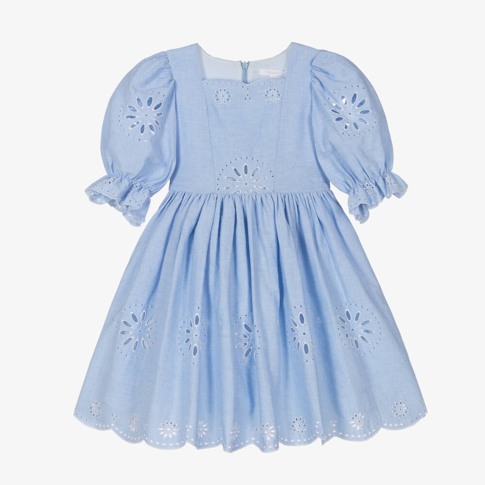 Exclusive to Childrensalon, a pretty blue dress for girls by luxury brand Patachou, woven from soft cotton. The square neckline, balloon sleeves and full hemline have beautiful cutwork embroidery with scalloped edges. A fixed tie fastens into a bow for a fitted silhouette and a concealed zip secures on the back.