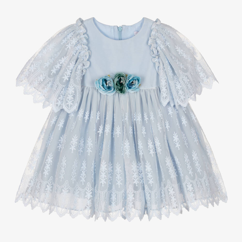 A gorgeous pale blue dress for little girls by Patachou, made in luxurious cotton tulle with a soft voile lining. Classically whimsical, this dress has a delicate floral embroidered pattern, with pretty faux flowers on the bodice. The concealed zip fastening is decorated with grosgrain ribbon trims for a pretty finishing touch.