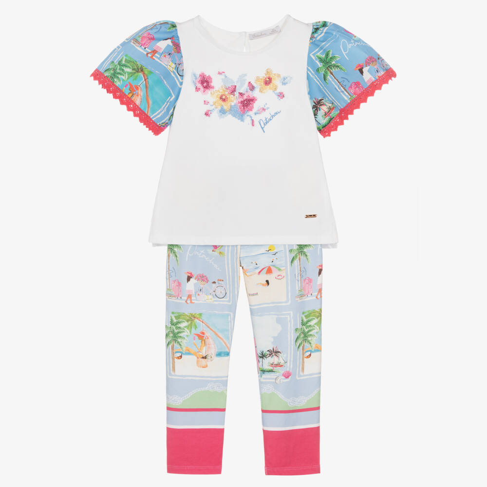 Exclusive to Childrensalon, a pretty white and blue leggings set for girls by Patachou. With a lovely cross stitch flower design on the front, the T-shirt has a white jersey body with split side vents and a rose gold logo tab sewn above the hem. The blue poplin sleeves gently gather on the shoulder for a feminine look. With pretty pink cotton lace trims, the sleeves are patterned in a contrast holiday print which is made to match the stretchy, full-length leggings.