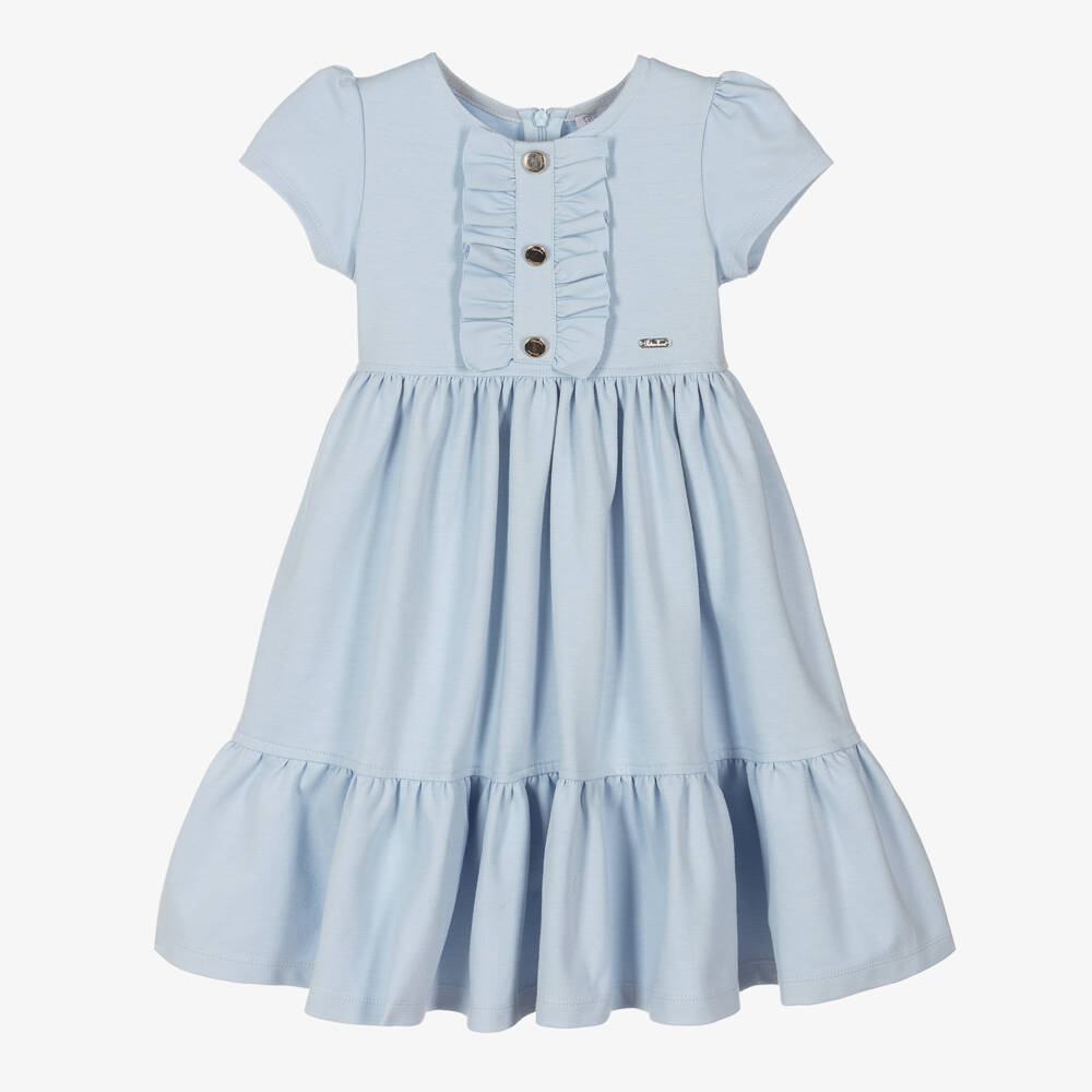 Pale blue dress for girls by Patachou, made in comfortable cotton jersey. It has cute puffed sleeves and a ruffle on the bodice with decorative shiny silver buttons, matching the silver logo tab. The skirt is gathered, with a frill around the hemline.