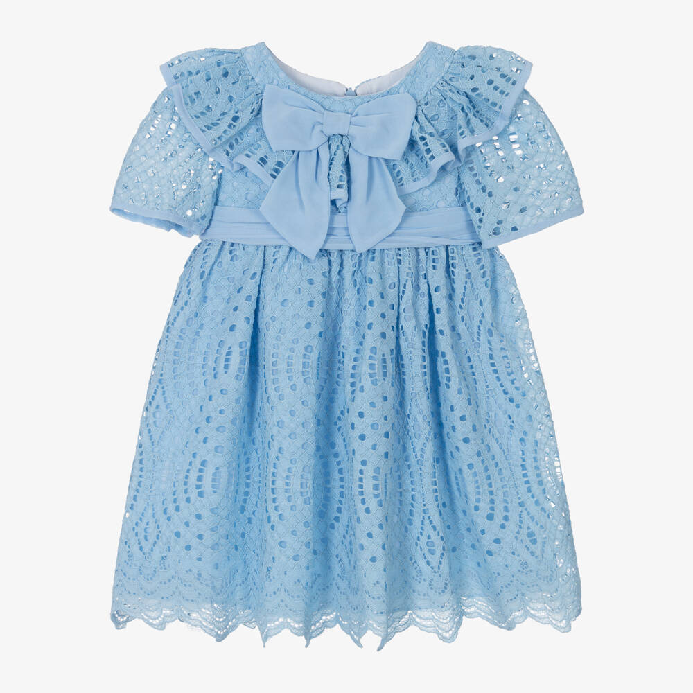 Exclusive to Childrensalon, a special occasion blue dress for girls by Portuguese brand Patachou. This elegant design is made in exquisite lace, with a scalloped hemline, and a gorgeous ruffle around the bodice. It has a gathered chiffon waistband, with a coordinating bow on the front. Lined in sheer chiffon and lightweight cotton, this beautiful dress fastens with a discreet zip on the back.