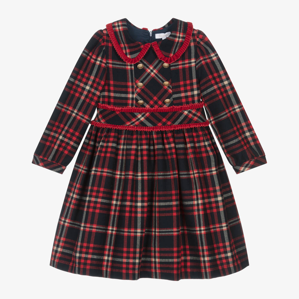 A navy blue and red tartan dress for girls by Patachou, made from soft brushed twill. It is decorated with red velvet frilled trims around the collar and the waistband, and has gold crest button embellishments on the chest for a traditional look. Lined with lightweight cotton, it has long sleeves with buttoned cuffs and fastens with a concealed zip on the back.