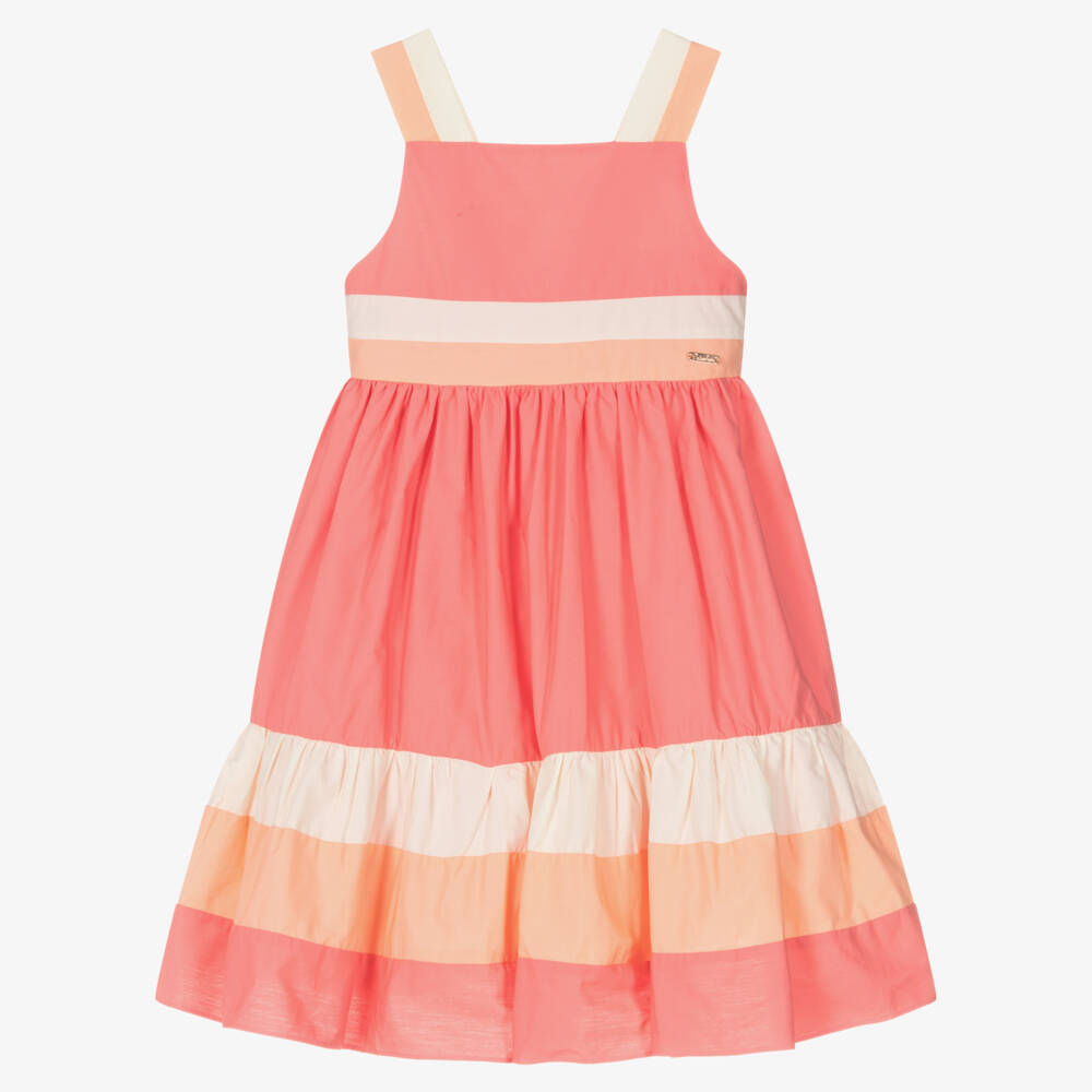 Girls coral pink sleeveless dress by Patachou, made in soft cotton poplin. Lined for comfort, it has gorgeous pastel orange and ivory stripes all-over. The bodice has a rose gold logo charm embroidered on the waist for a glamorous touch. The skirt has a lovely tiered effect for a feminine silhouette, and it fastens seamlessly with a concealed zip on the back.
