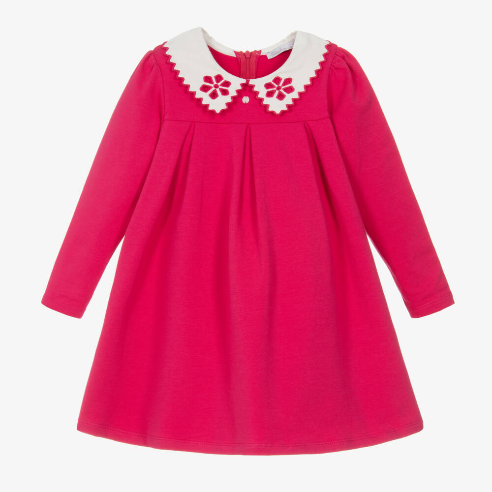 Fuchsia pink cotton dress for girls by Patachou. Lovely for an occasion or smart day out, this long-sleeved dress has an empire-line with a box-pleated skirt and a delicate white twill collar with a pink broderie anglaise design. It is made in soft, stretchy and medium-weight cotton jersey, with a comfortable fleecy-feel underside for added cosiness. The dress fastens with a neat hidden zip on the back and the designer's pearlescent logo charm is stitched on the bodice to complete the look.