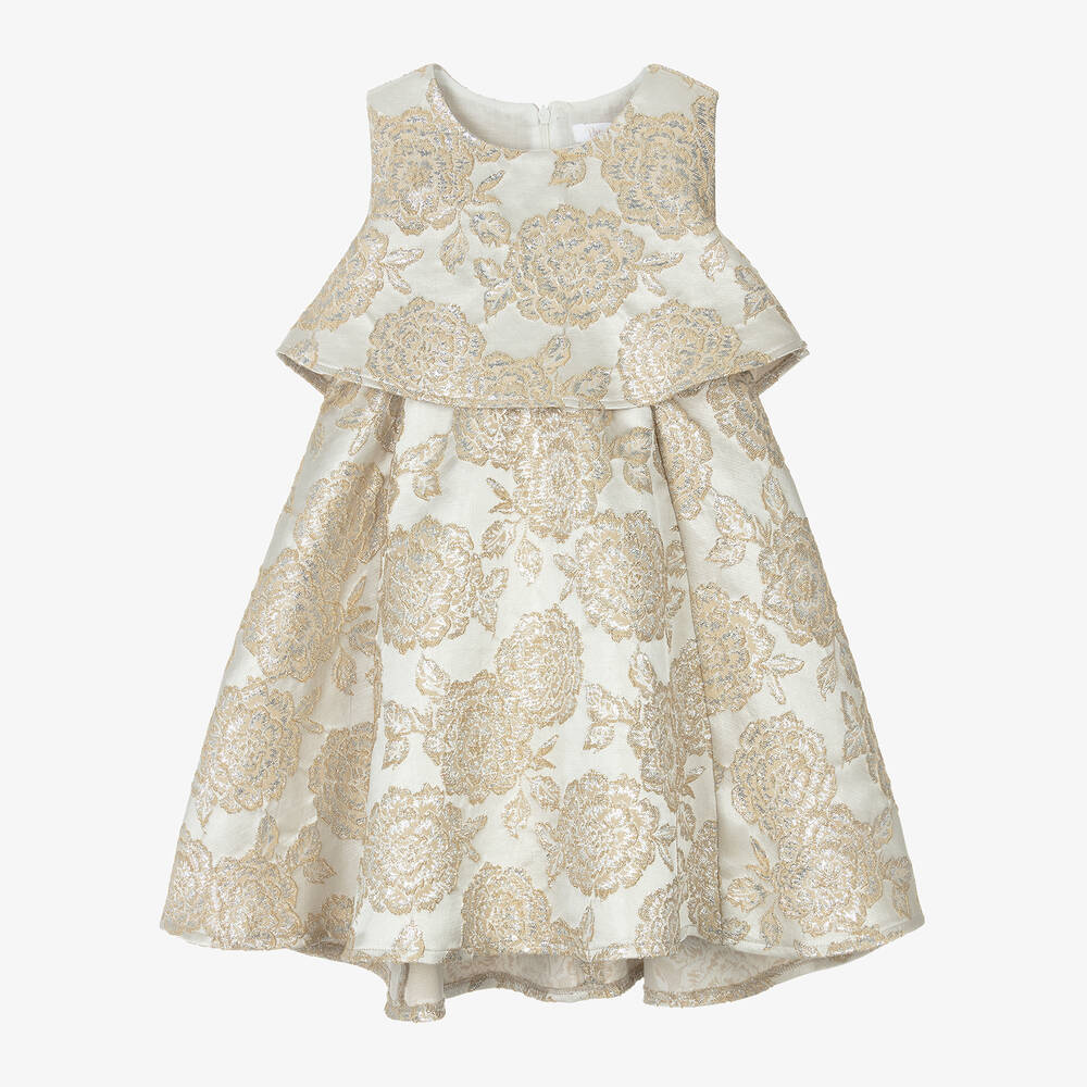 Simply stunning, this beautiful pale gold Patachou dress for girls is exclusive to Childrensalon. Made with shimmering satin fabric, it has a gorgeous floral jacquard pattern that sparkles with silver thread accents. A layered, flared design with an elegant high-low hem, this sleeveless dress is trimmed with a gold satin bow on the back and fastens neatly with a concealed zip. It is fully lined in soft and lightweight cotton for comfortable wear.