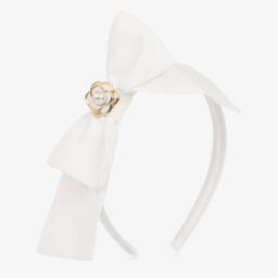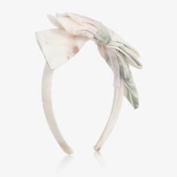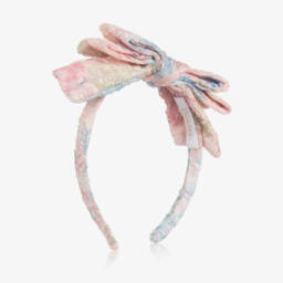 Exclusive to Childrensalon, this girls gold hairband by Patachou brings a touch of glamour to any wardrobe. The flexible band is adorned with a large bow embellished with shimmering sequins, creating a dazzling accessory that adds a luxurious finishing touch to an outfit.