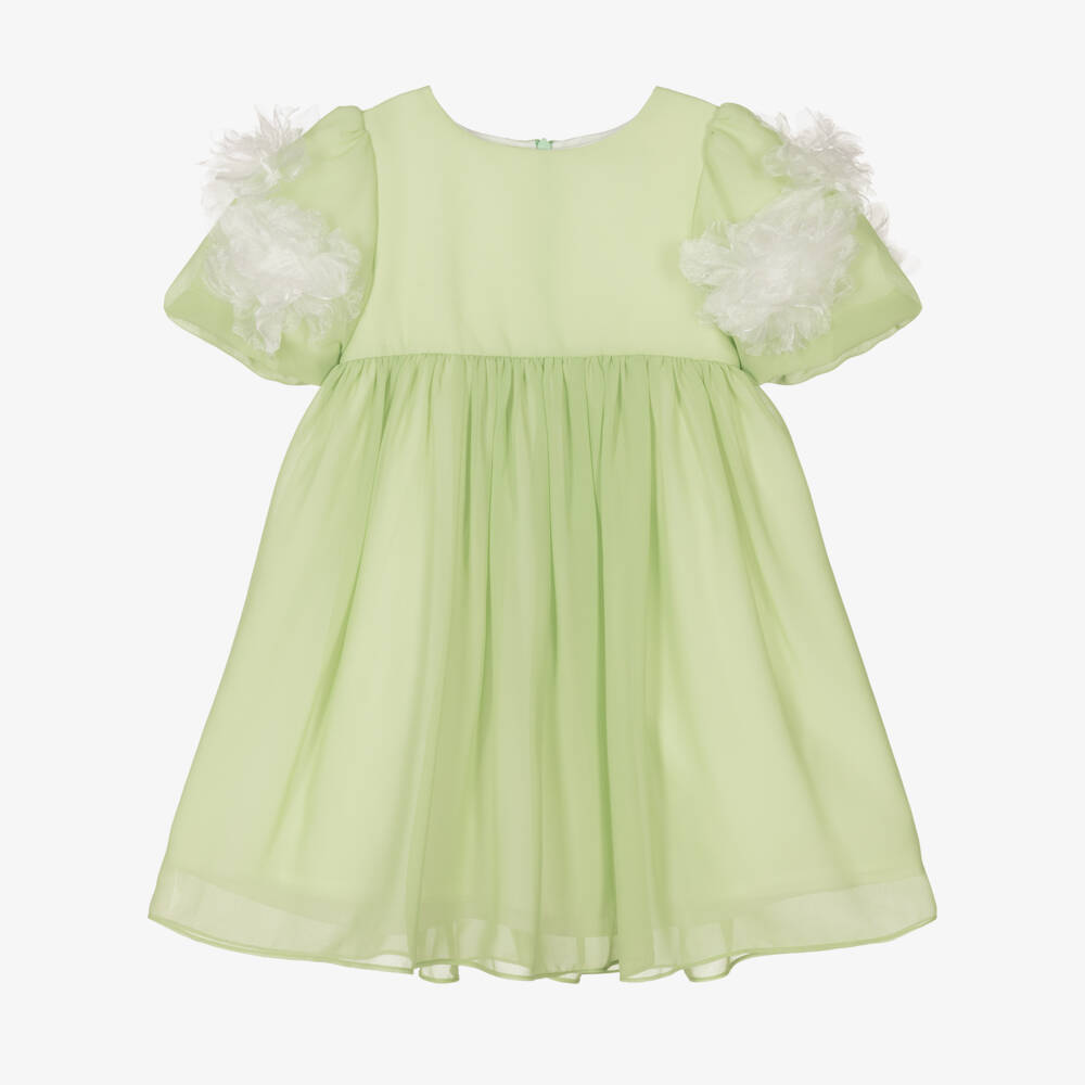 Lovely lime green dress for little girls by Patachou, exclusive to Childrensalon. This soft crêpe dress has a timelessly beautiful empire-line waist. Gorgeous white shimmering organza flowers are stitched on the puffed sleeves for a dramatic bouquet effect. Fastening with an easy-dressing back zip, the soft and lightweight cotton voile full-lining adds endless comfort.