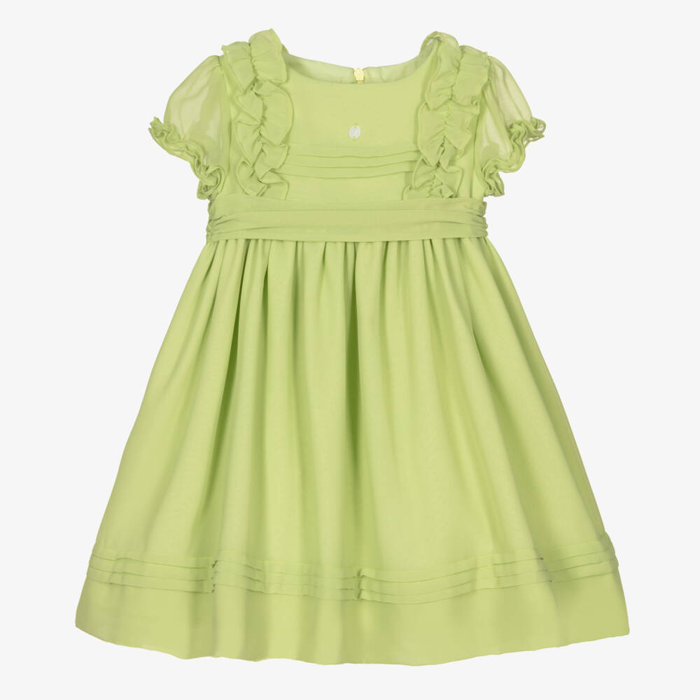 Exclusive to Childrensalon, a green special occasion dress for younger girls by Patachou. Made in soft lightweight chiffon, it has pretty ruffles and pleats on the bodice, with matching trim on the hem. The puffed sleeves have elasticated frilled cuffs and there is a fixed sash waistband. The dress has a comfortable lightweight cotton lining with tulle trim for added volume.