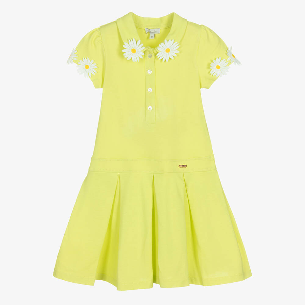 In a Childrensalon exclusive, girls can channel tennis style in this lovely lime green polo dress from Patachou. Stitched on the collar and capped sleeves are sweet white fabric flowers with yellow embroidered centres, complementing the pearlescent front buttons for a coordinated look. This sports-luxe look is made in soft and stretchy cotton piqué, with an on-trend dropped waist and box-pleated skirt. The brand's rose gold logo plate is stitched on the waist to finish the design.