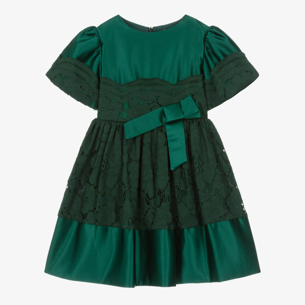 Beautiful emerald green dress for girls by classic Portuguese brand Patachou, ideal for any special occasion. Made in sumptuous satin, the bodice has a beautiful floral lace overlay above the waistline and a large, fixed satin bow, with matching lace overlays on the full, puffed sleeves. The dress has a gathered, sheer lace skirt with a deep satin border. It has a double lining in soft cotton voile for comfort and a concealed zip on the back for a neat finish.