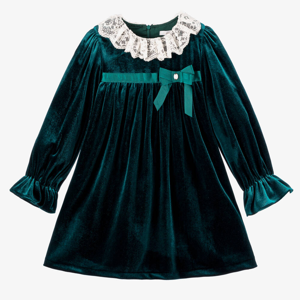 Exclusive to Childrensalon, a lovely dark green dress for girls by Patachou. Made in sparkly velour, it has a pretty lace collar and a grosgrain ribbon and bow trim across the front. It has a full skirt and elasticated cuffs on the long gently puffed sleeves. Fully lined for comfort, it fastens neatly on the back with a concealed zip.