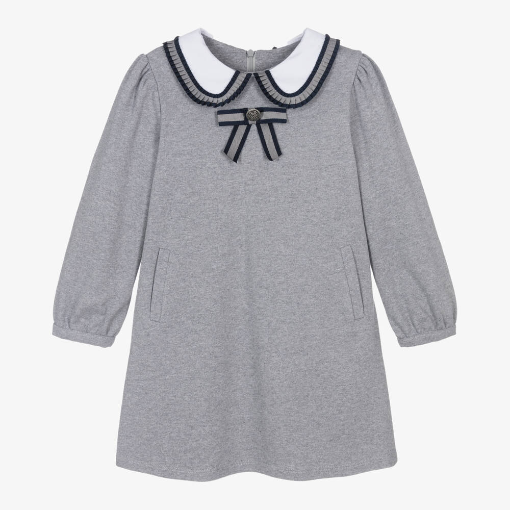 Exclusive to Childrensalon, a lovely grey marl dress for girls by Portuguese brand Patachou. Made in comfortable cotton jersey, it has a white Peter Pan collar trimmed in grey and and navy blue pleated grosgrain ribbon. There are gently puffed long sleeves, front pockets, and a concealed zip fastening on the back. The front is decorated with a classic grosgrain ribbon bow and a crested button to finish.