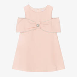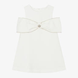 This gorgeous ivory special occasion dress is by Patachou. It has an eye-catching bow appliqué across around the bodice, trimmed in sparkling diamantés and pearl beads. Made in soft crêpe, this sleeveless, A-line style is elegantly simple. Lined for comfort, it fastens neatly with a concealed zip on the back.