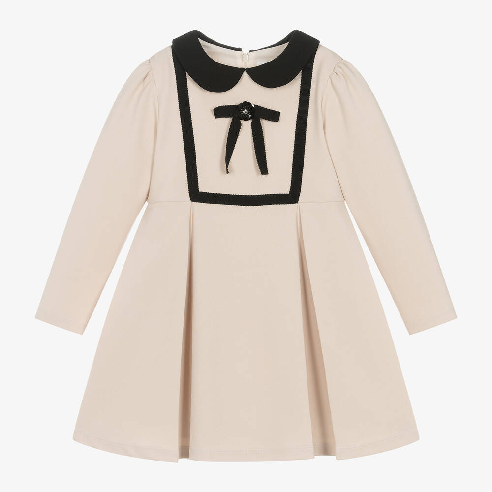 Ivory dress for girls by Patachou, made in stretchy crêpe jersey with a textured finish. This classic silhouette has a black Peter Pan collar and a placed grosgrain trim on the bodice. A 3D sequin flower, with a diamanté in the centre, adds an extra pretty touch to the black bow. The long sleeves gently gather on the shoulder and the skirt is fully shaped with inverted pleats. Lined with cotton voile, this timeless piece zips up on the back.