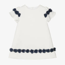 Lovely ivory chiffon dress for girls by classic brand Patachou, with beautiful floral embroidery and cut work. It has pretty ruffles and grosgrain trims on the bodice and a neat, concealed zip fastening on the back.