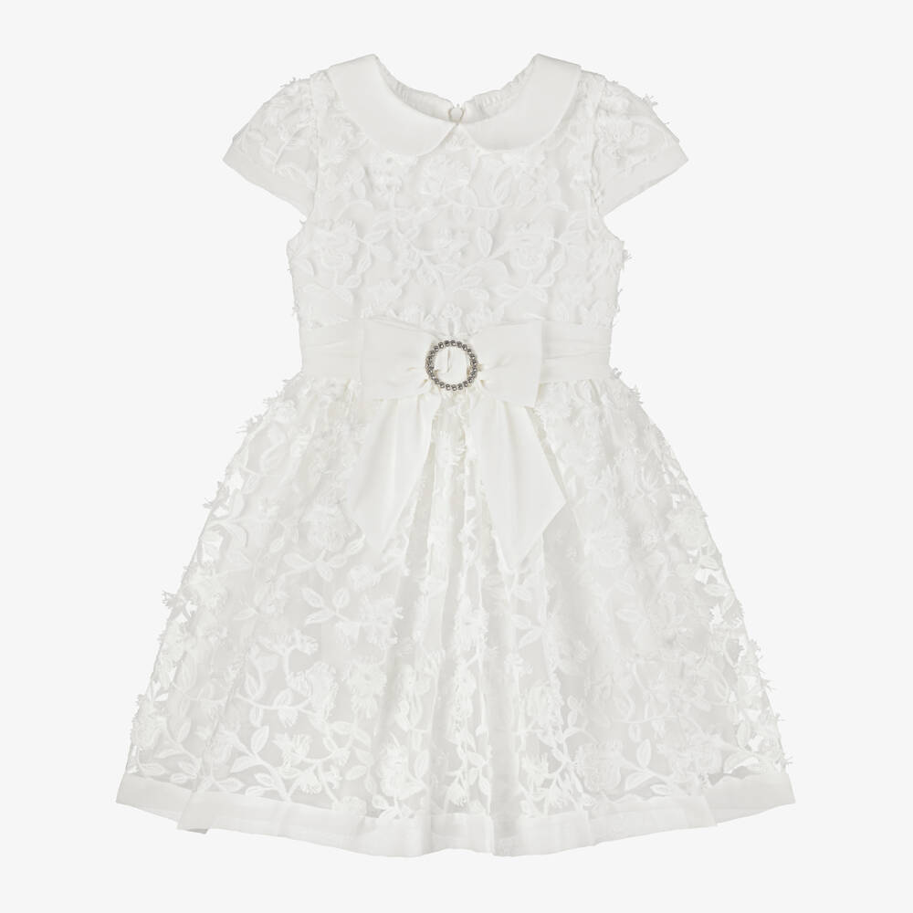 Exclusive to Childrensalon, a special occasion ivory dress for girls by Portuguese brand Patachou. This elegant design is made in beautiful floral tulle jacquard, with exquisite feathery detailing. It has a classic Peter Pan collar and a gathered chiffon waistband, trimmed with a coordinating bow on the front. Adding a touch of glamour, the bow is decorated in the centre with a sparkling diamanté brooch. Lined in sheer chiffon and lightweight cotton, this lovely dress fastens with a discreet zip on the back.