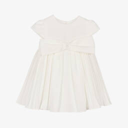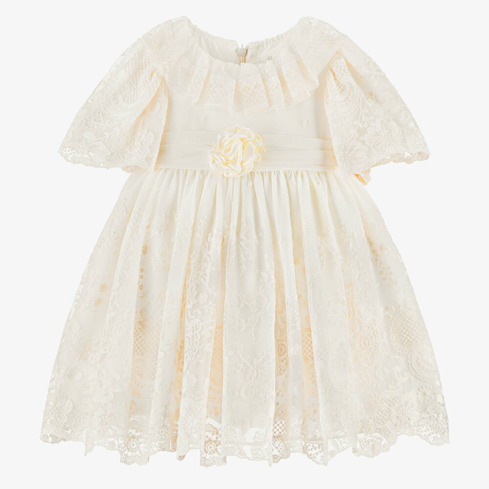 A special occasion dress for girls in ivory tulle by Portuguese designer Patachou, with beautiful floral embroidery. It has a ruffled collar, pretty puffed sleeves and a chiffon waistband with a central satin flower appliqué. The dress is fully lined in soft cotton for comfort, with an extra layer of chiffon on the skirt for volume. It fastens with a concealed zip on the back, edged in grosgrain ribbon.