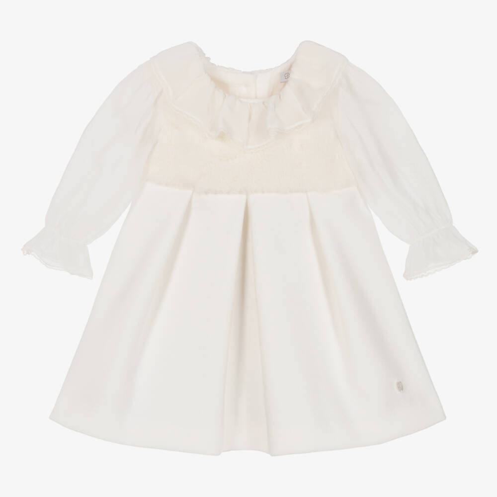 A beautiful ivory dress for little girls by Portuguese brand Patachou, ideal for special occasions. It has a super soft, faux fur bodice, with a sheer chiffon collar and sleeves, trimmed in delicate lace. The pleated, beautifully soft skirt is mid-weight with a brushed wool feel and a logo charm sewn by the hemline. The dress has a soft cotton voile lining for comfort and branded button fastenings on the back.