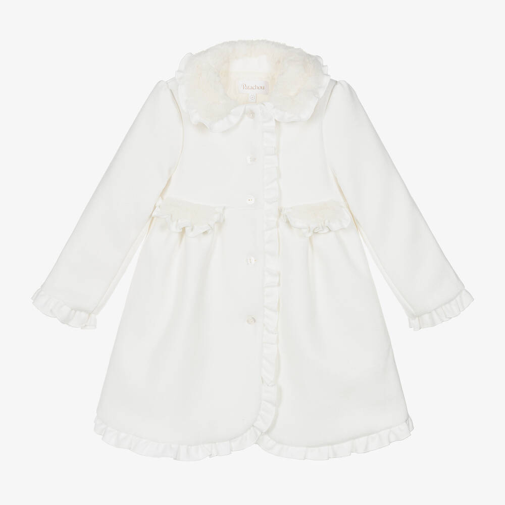 Lovely ivory coat for girls by Portuguese brand Patachou, with ruffle trims and faux fur detailing. Soft, mid-weight and felted, it fastens with branded buttons on the front and is lined in silky satin. It is lightly padded for warmth.