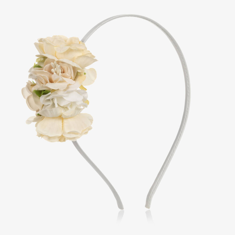 Girls ivory flower hairband by Patachou, an exclusive to Childrensalon. The cluster of pretty fabric flowers is set on a satin-covered slim hairband for an elegant finishing touch.