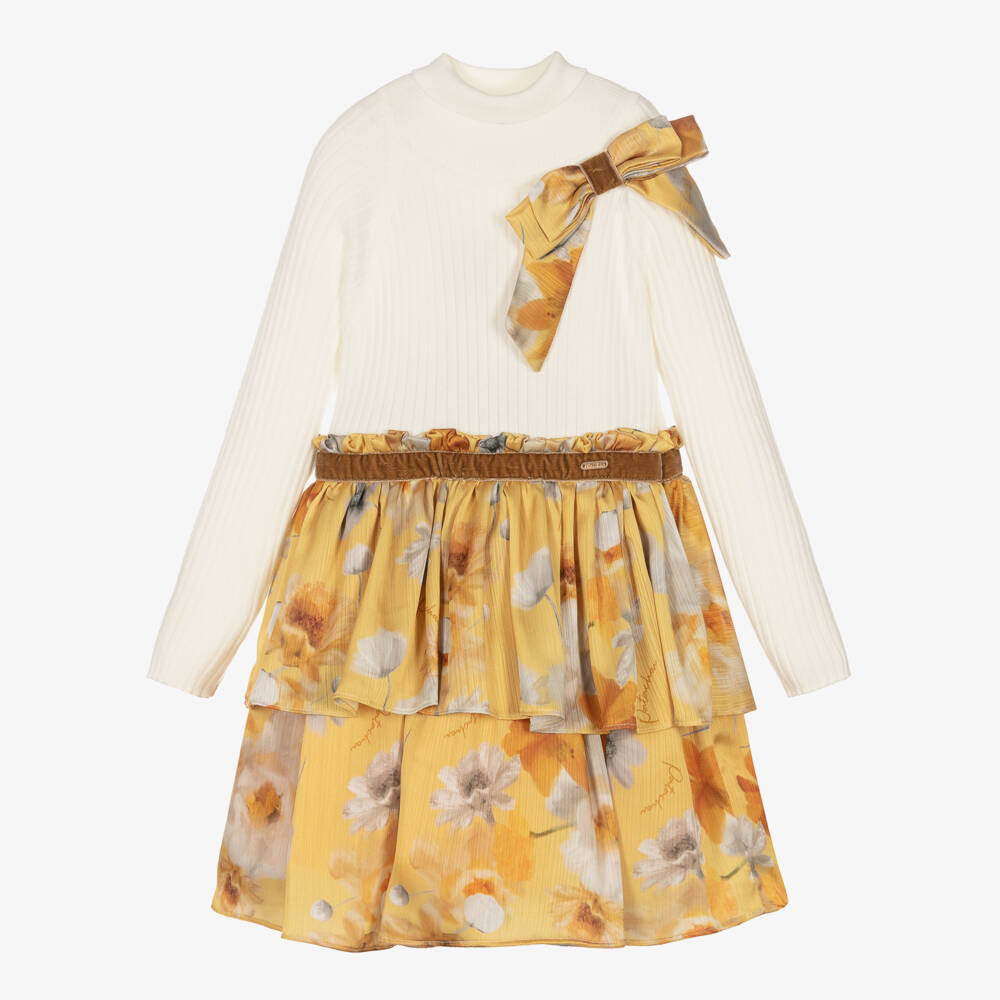 Girls Ivory Jersey & Yellow Chiffon Dress