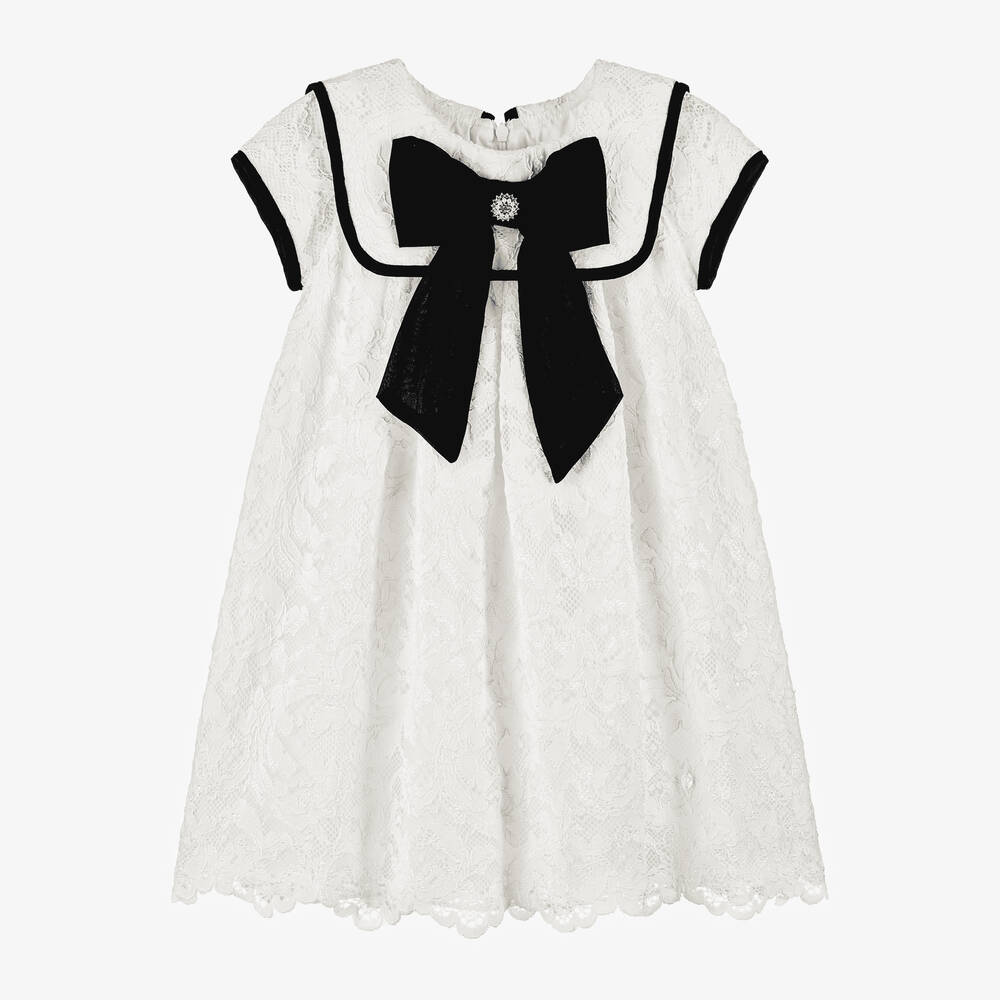 Girls Ivory Lace & Black Bow Dress