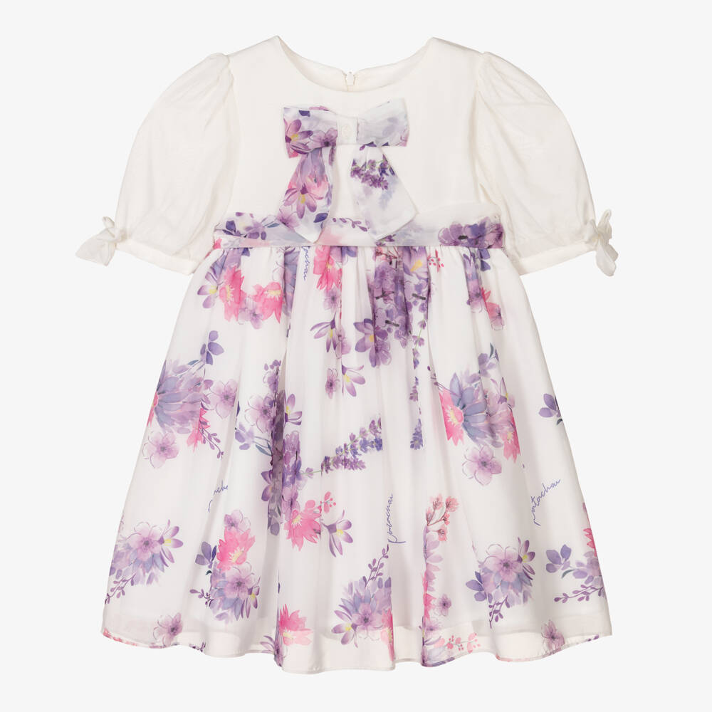 Exclusive to Childrensalon, an ivory chiffon dress for little girls by Patachou. Soft and lightweight, this traditionally-styled dress has a romantic purple and pink floral print on the skirt with a matching bow appliqué on the bodice. It has a fixed sash on the waist and a concealed zip fastening on the back. The pretty sheer sleeves gather on the shoulder and the full cotton voile lining creates beautiful volume.