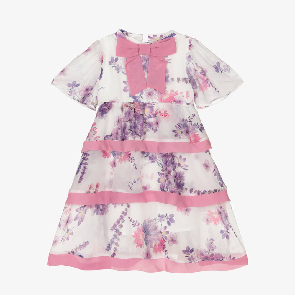Gorgeous ivory dress for girls by Patachou, exclusive to Childrensalon. Beautifully soft, the cascading tiers of chiffon are patterned with purple and pink flowers, and edged with lilac pink crêpe for a truly feminine look. Elegant, sheer sleeves and a bow on the neckline add nostalgic beauty to this lovely piece. The cotton lining is soft and comfortable, and the dress fastens with a hidden zip on the back for a neat look.