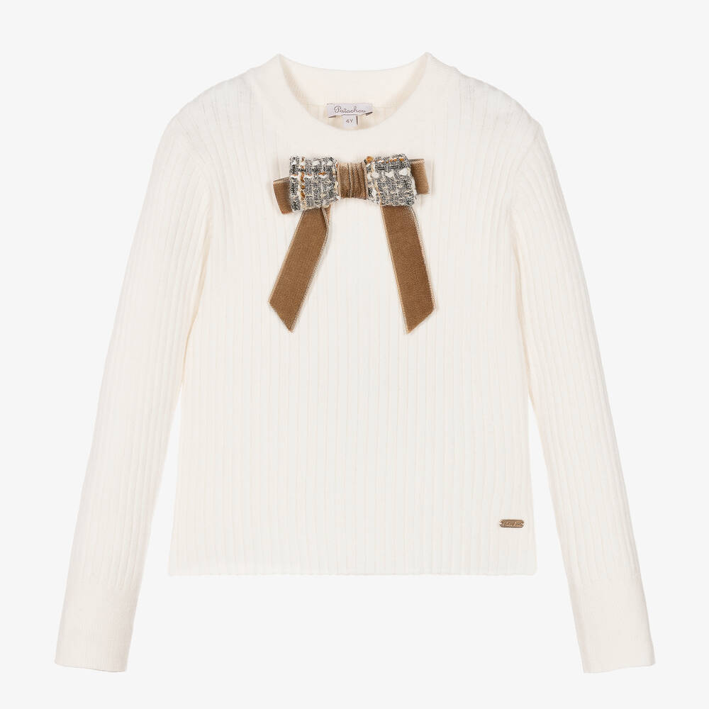 A ribbed ivory sweater for girls by luxury brand Patachou, knitted in the softest viscose blend. Traditionally styled, this long-sleeved top has a blue and dark beige velvet and tweed bow on the chest, with a gold logo charm on the hem.