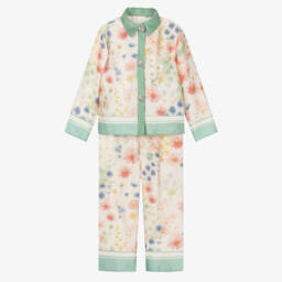 Exclusive to Childrensalon, a chic, ivory tweed trouser set for girls by Patachou, woven with a subtle, sparkly thread. Ideal for a special occasion, both pieces have eye-catching feather trims and are fully lined with cotton for comfort. The short-sleeved jacket has patch pockets, a peplum hem and beautiful pearl and diamanté buttons for a glamorous touch. The stylish trousers have an adjustable waistband and side zip fastening with a matching, statement button.
