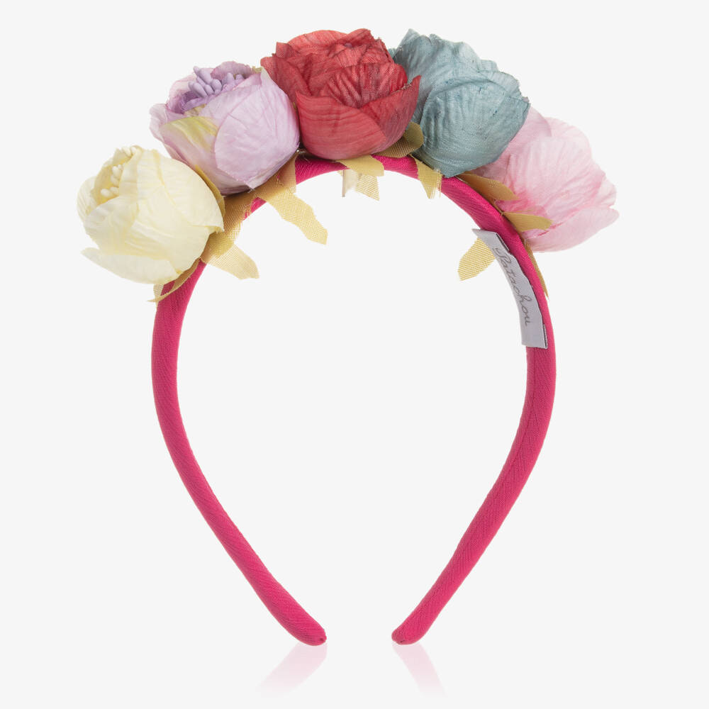 Gorgeous floral hairband for girls by Portuguese brand Patachou. The fuchsia pink fabric-covered flexible slim band is decorated with a row of lovely and colourful fabric flowers, giving it a romantic and beautiful finishing touch.