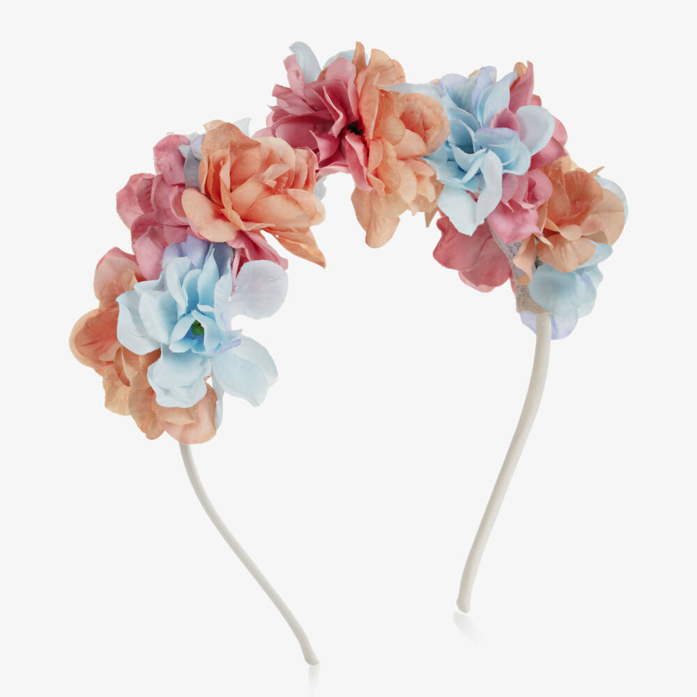 Pretty hairband for girls from Patachou, with a flexible band covered with white satin for comfort. There are pretty 3D fabric flowers in blue, orange and pink across the top for a feminine finish.
