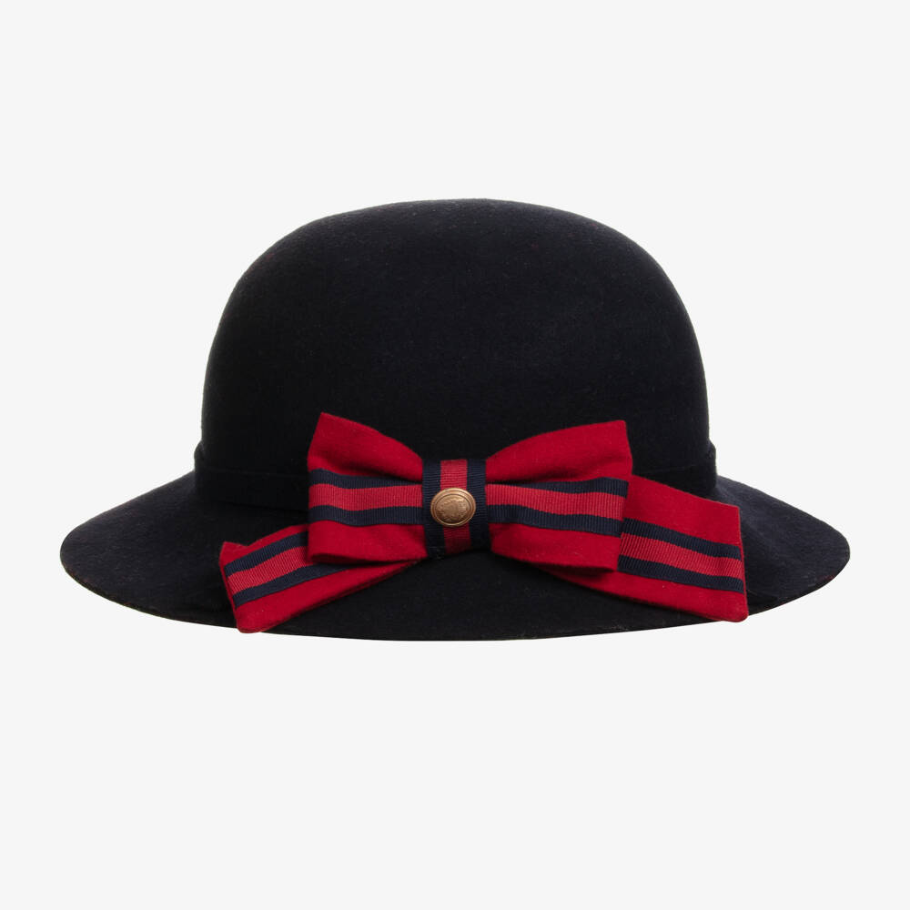 This smart navy blue hat for girls by Patachou is traditionally styled. Ideal for colder weather, it is made in soft, cosy and comfortable wool. A charming red and navy blue striped bow with a gold-tone crest accent is stitched on the front.