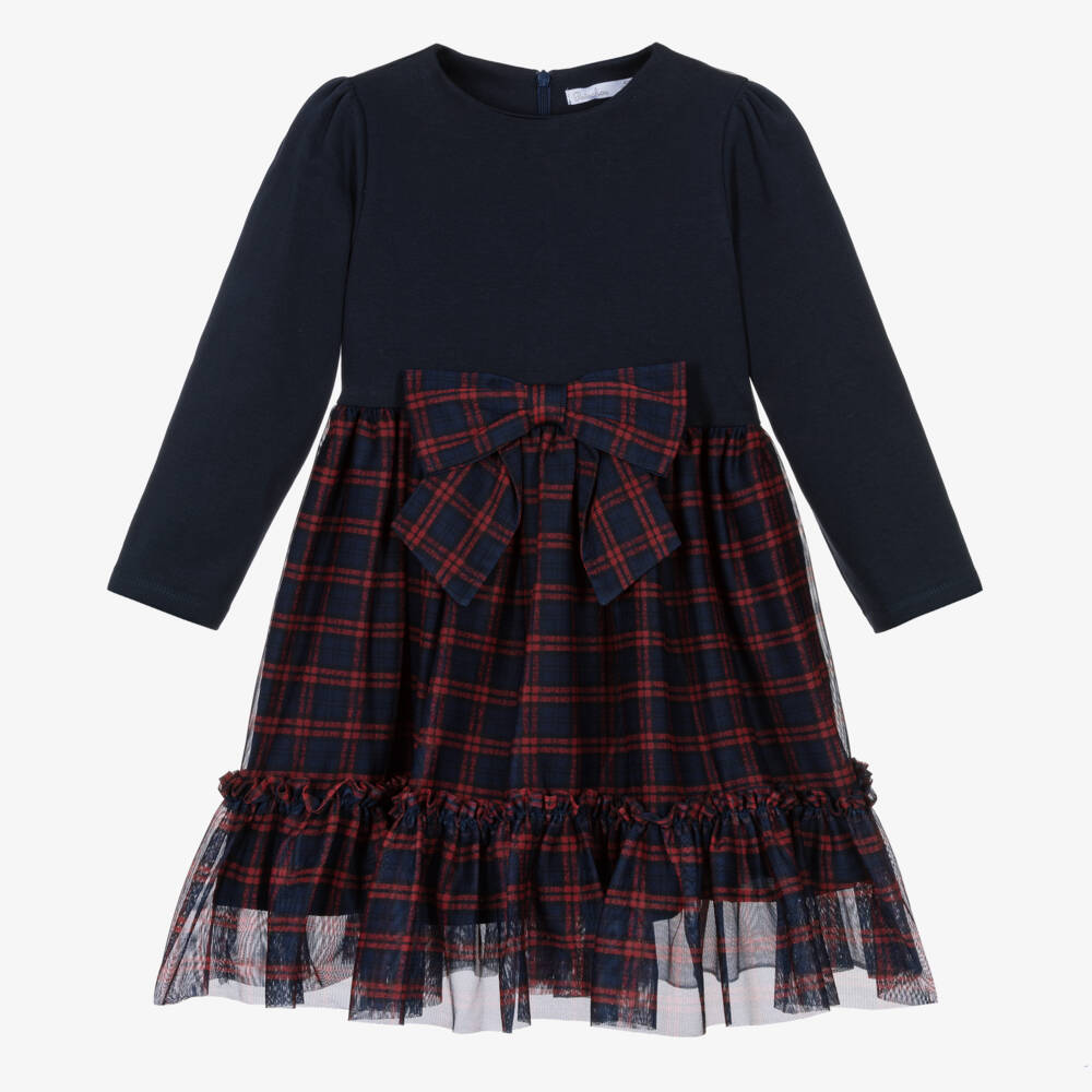 Girls Navy Blue & Red Tartan Tulle Dress
