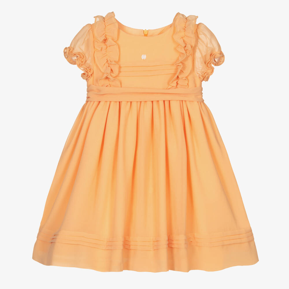 Exclusive to Childrensalon, a pale orange special occasion dress for younger girls by Patachou. Made in soft lightweight chiffon, it has pretty ruffles and pleats on the bodice, with matching trim on the hem. The puffed sleeves have elasticated frilled cuffs and there is a fixed sash waistband. The dress has a comfortable lightweight cotton lining with tulle trim for added volume.