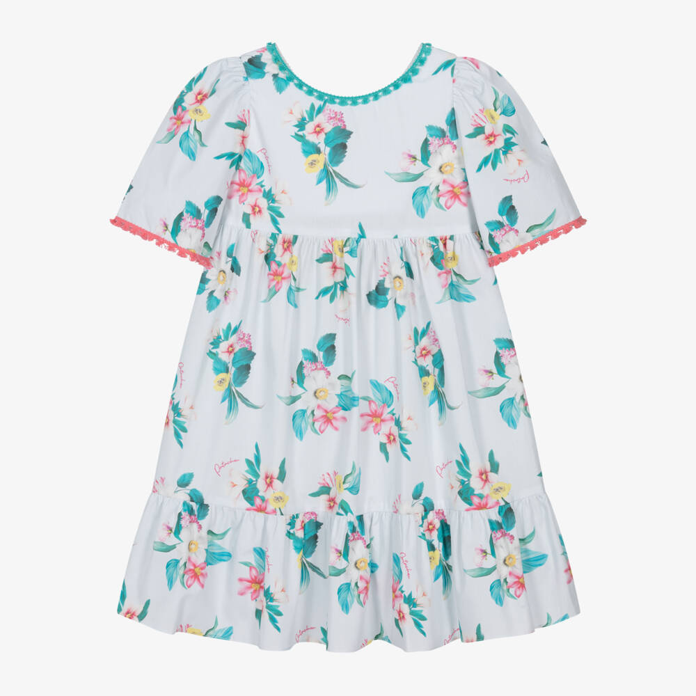 A lovely pale blue cotton poplin dress for girls by Patachou. It is patterned with pretty flowers and logo scripts in teal blue, pink and yellow with braided tassel trims and a ruffled hemline. Designed in a loose fit with gently puffed short sleeves and a subtle V-back, it is ideal for casual warm weather styling. It fastens with a neat zip on the back.