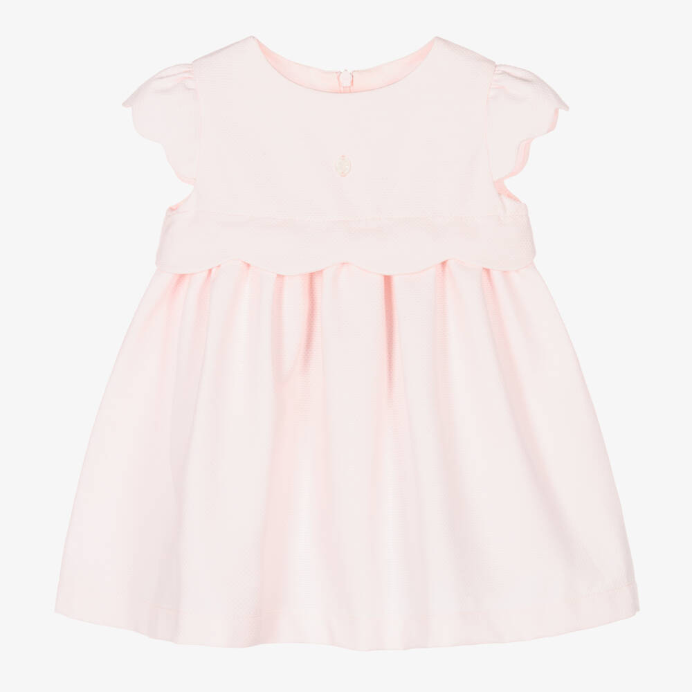 Sweet pale pink dress for girls by Patachou, made in mid-weight cotton with a honeycomb pattern. In the brand's typical classic style, this dress has scalloped trims across the middle and on the capped sleeves. It is lined in soft voile, fastens with a concealed zip on the back, and has a small logo charm on the front.