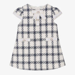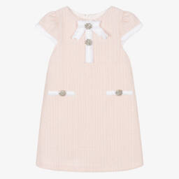 Chic pale pink dress for girls by Patachou, made in soft cotton blend tweed. This elegant, A-line design features fringed grosgrain trim, adorned with diamanté buttons at the front. The round neckline and capped, puff sleeves add to its timeless charm. Fully lined in soft cotton, it ensures comfort as well as style.