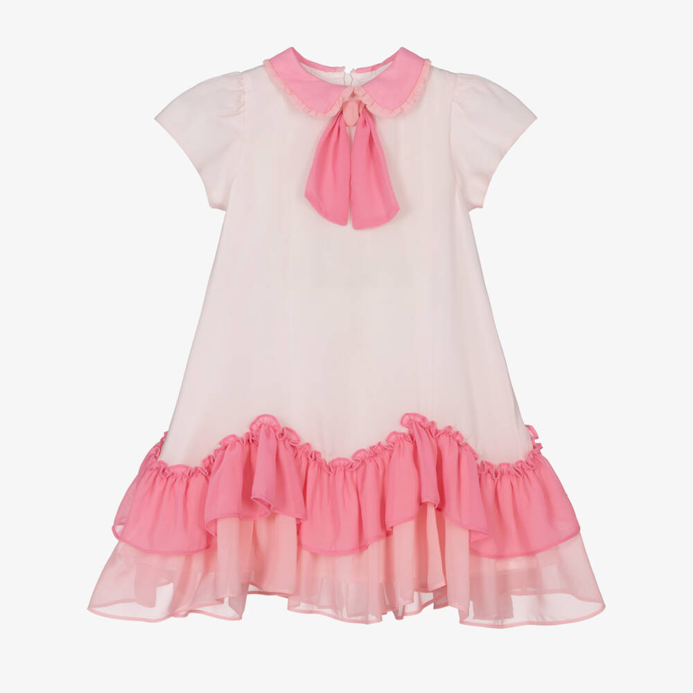 In pink, this lovely special occasion dress for girls is by Patachou. Made in sheer lightweight chiffon, it has elegant puffed sleeves, pretty ruffle trims, and a statement bow on the front. Lined in soft cotton for comfort and modesty, it fastens neatly with a concealed zip on the back.