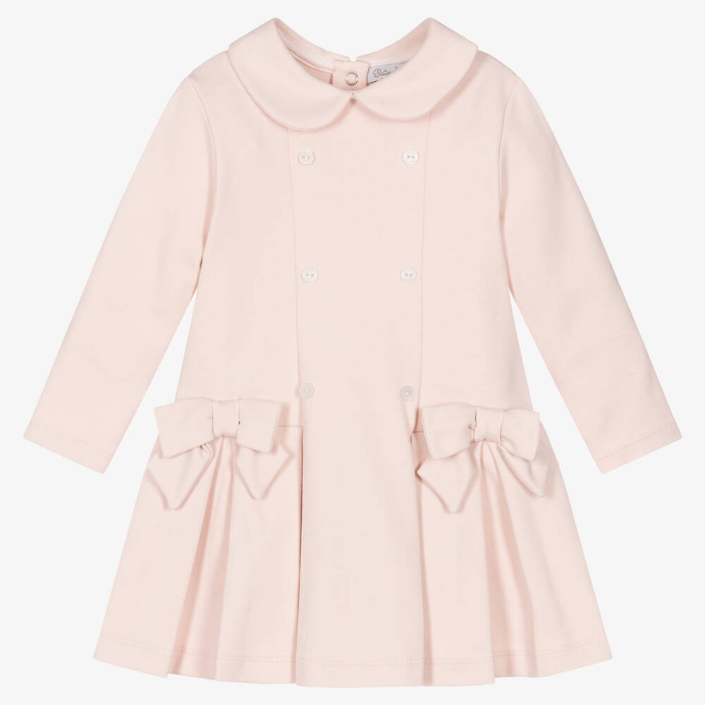 Beautifully combining comfort and elegant style, this pink dress for girls is from Portuguese brand, Patachou. Made in luxuriously soft cotton jersey, it has chic coatdress styling with a rounded collar, faux double-breasted buttons on the front and a pleated skirt with pretty bow appliqués. To help with dressing, there are easy popper fastenings on the back.
