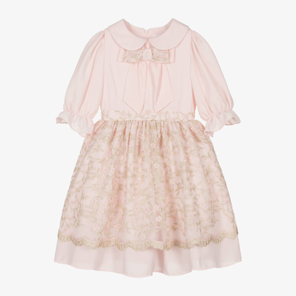 A beautiful pale pink dress for girls from Portuguese brand, Patachou. It is made with soft and flowy crêpe, with a pretty tulle overlay embroidered with pink flowers and shimmery gold vines. Lovely and feminine for smart occasions, it has a sweet rounded collar with a statement bow underneath and gently elasticated, elbow-length puffed sleeves. It has a lightweight cotton lining and fastens neatly with a seamless zip on the back.