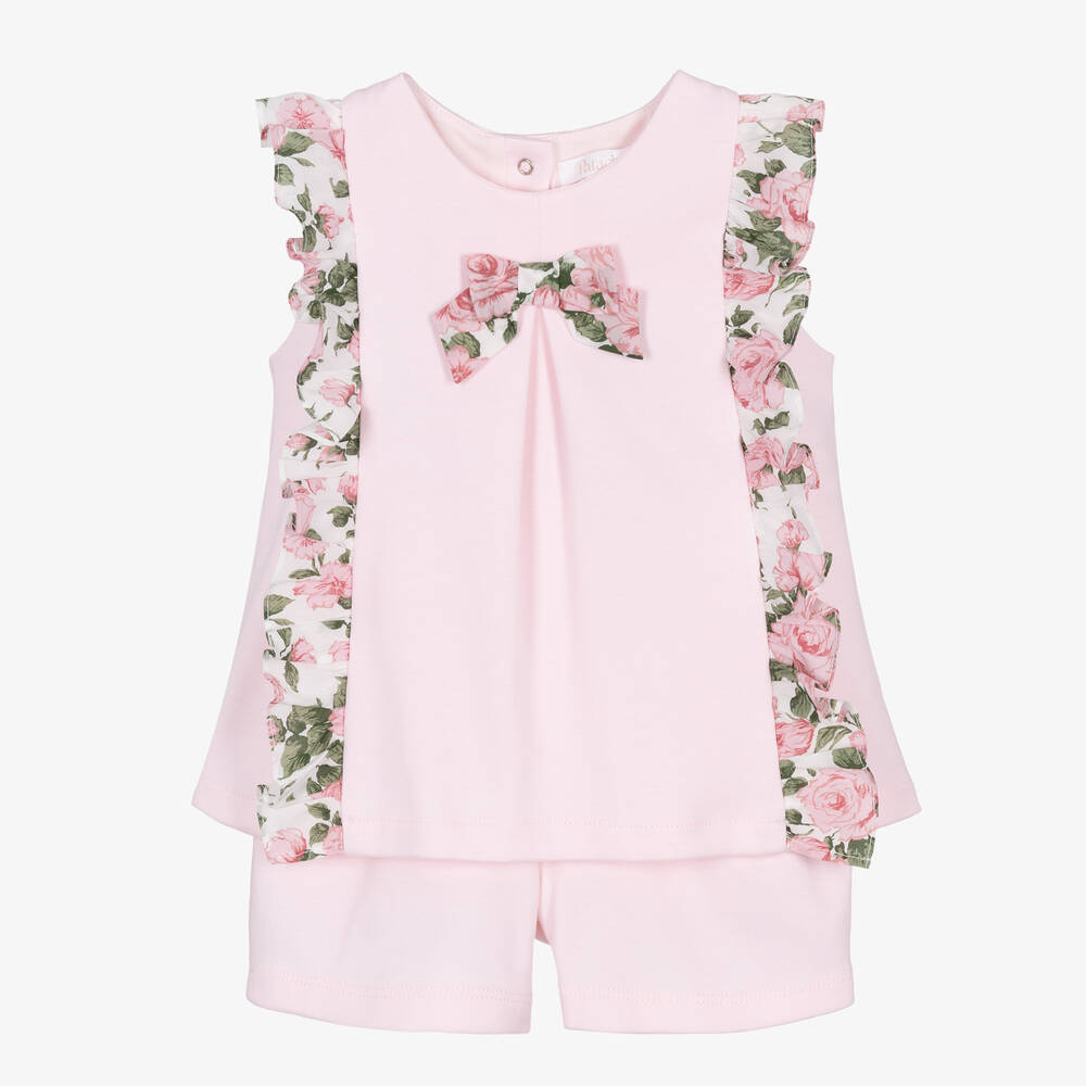 Pale pink shorts set for little girls by Patachou, made from soft and stretchy cotton jersey. The top has frilly floral trims crafted in Liberty fabric with a neat inverted pleat on the front for a charming look. Poppers fasten on the back of the top, and an elasticated paperbag waist finishes the matching shorts.