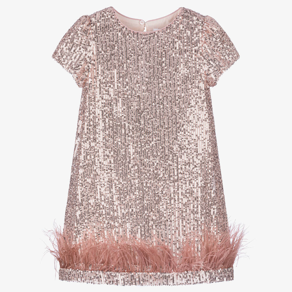 Eye-catching pink sequinned dress for girls by Patachou, ideal for special events and parties. In a gentle A-line design, it has a fabulous feather trim around the hemline. Lined in voile for comfort, it fastens with a concealed button and loop around the back.