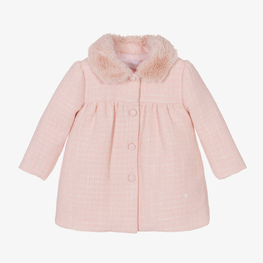 A light pink tweed coat for girls by Portuguese brand Patachou, with a lightly textured feel. This traditional style has a soft faux fur collar and fabric-covered buttons on the front. A pearlescent logo charm is stitched above the hem and useful pockets are concealed on the side seam. Lined with beautifully soft fleece, it is lightly padded for warmth.