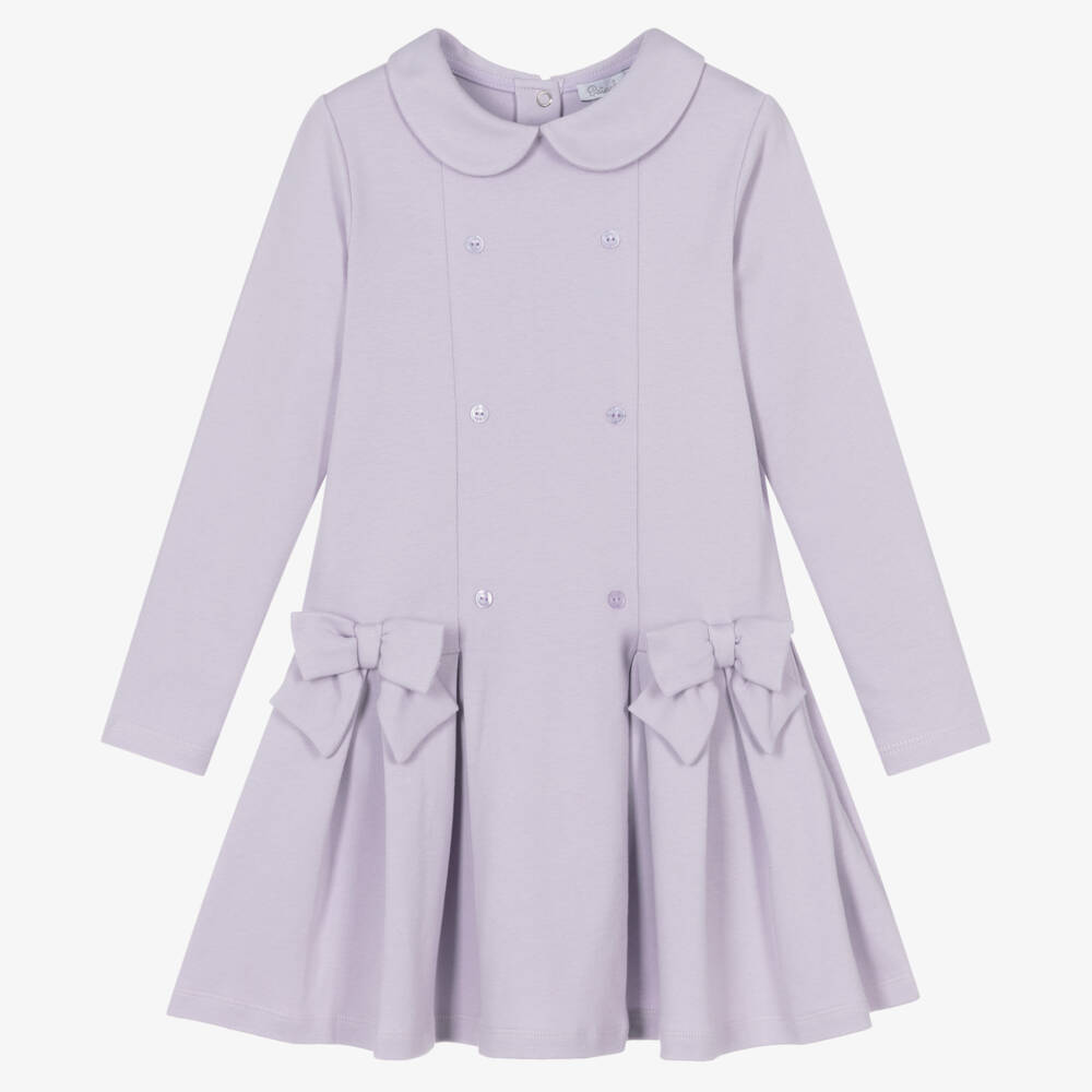 A lovely lilac purple dress for girls by Patachou, exclusive to Childrensalon. Made from soft and stretchy cotton jersey, it has a Peter Pan collar and decorative, branded buttons on the front. There are popper fastenings on the back and a pleated skirt for added movement. The pretty bows on the front add a lovely finishing touch.