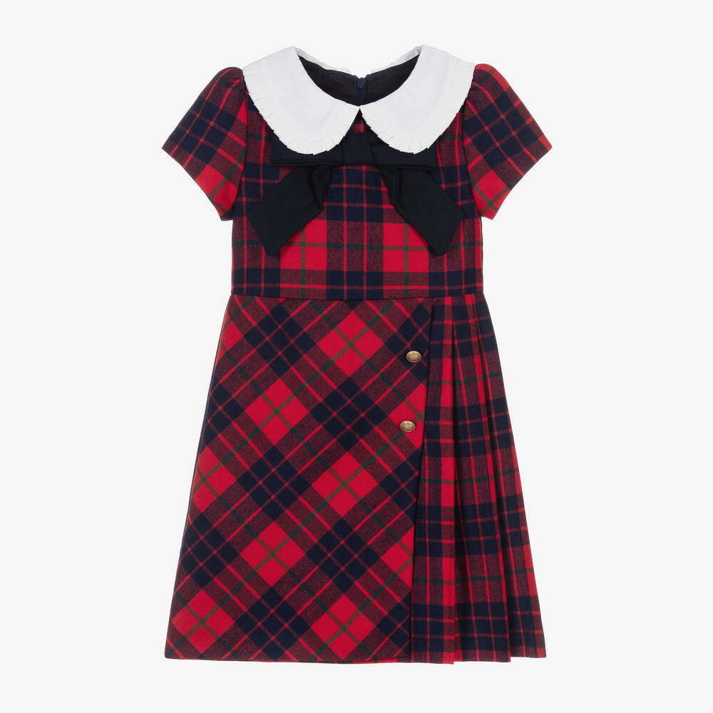 A timeless red and navy blue tartan dress for girls by Patachou, exclusive to Childrensalon. Lovely for a festive occasion, it is made in beautifully soft viscose-blend flannel with a lightweight cotton lining for comfort. For a smart, classic look, it has a statement white collar with pleated trim and a navy blue bow on the chest. The capped short sleeves are prettily puffed and the pleated skirt has a flat front panel with decorative gold crest buttons. There is a concealed zip fastening on the back.