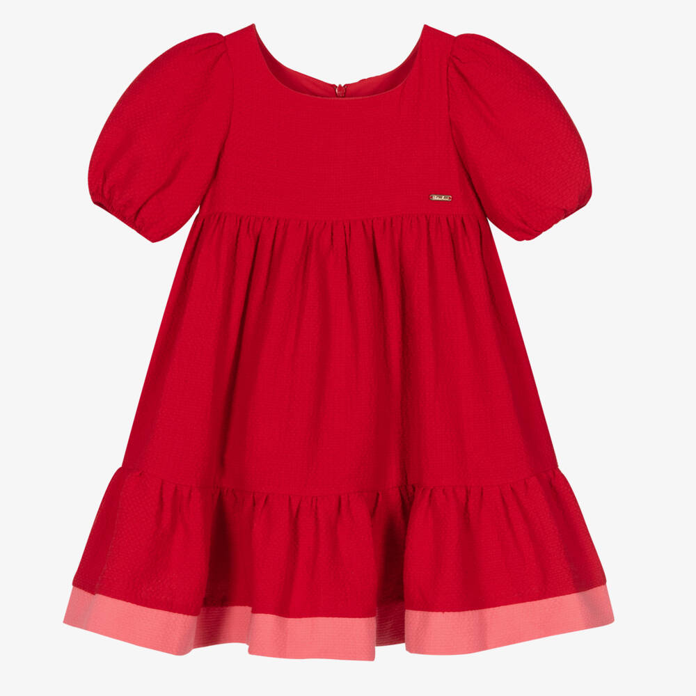 An exclusive to Childrensalon, this red dress for girls from Portuguese brand Patachou is made in soft woven cotton with a lovely textured feel. With puffed sleeves and a loose flared skirt, it has a beautiful shape without restricting movement. There is a branded rose gold metal logo plate on the front and the hem is trimmed with contrasting pale pink for a fun finish. The zip fastening is neatly concealed on the back.