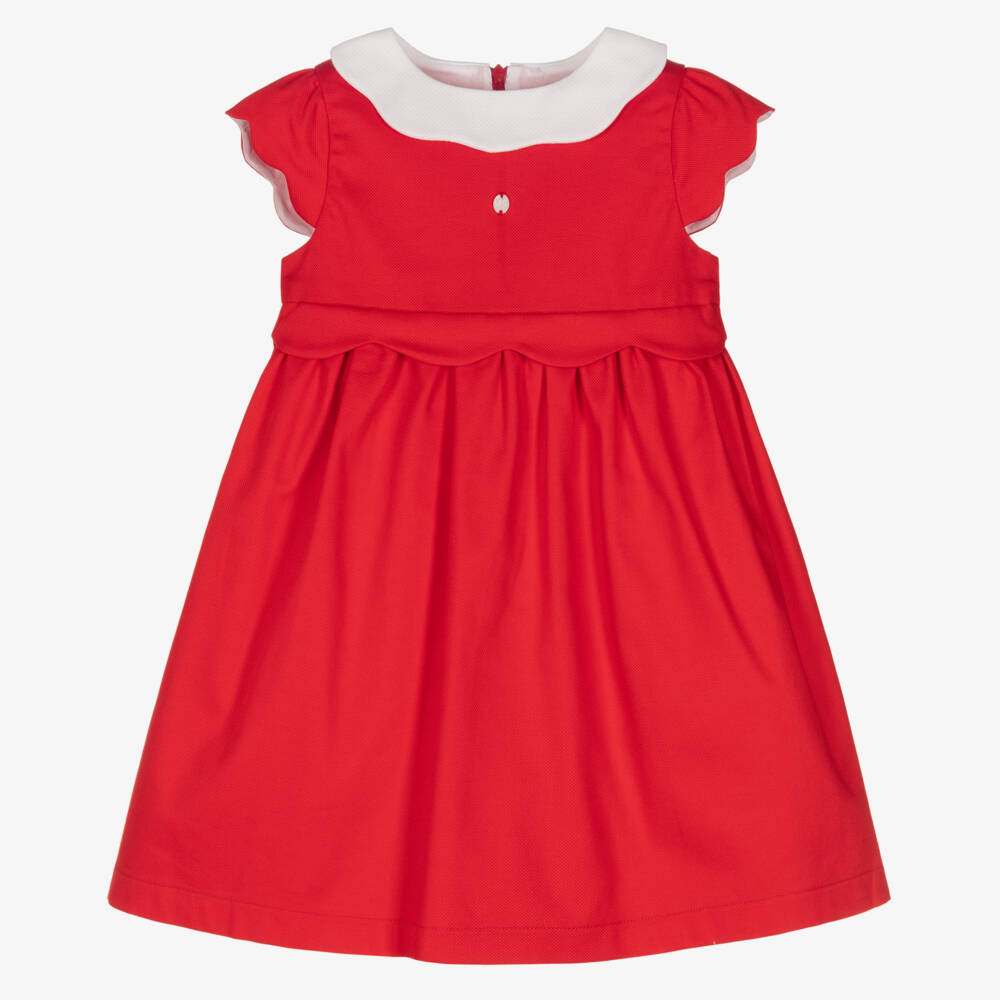 Exclusive to Childrensalon, a beautiful red dress for girls by Portuguese brand, Patachou. Lovely for smart occasions, it is made in woven cotton with a luxurious textured feel and is lined in lightweight voile for comfortable wear. This simple classic style has a white waffle weave collar and pretty scalloped trim on the capped sleeves and waist. A pearly branded charm on the chest gives a discreet designer touch and the dress fastens with a concealed zip on the back.