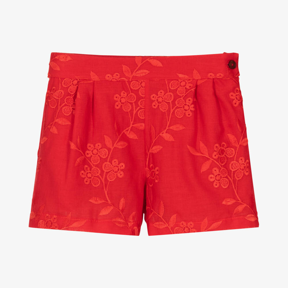 Fabulous red cotton shorts for girls by classic Portuguese brand Patachou, exclusive to Childrensalon. Ideal for warm days, they are made and lined in lightweight voile, and decorated with beautiful floral embroidery. They have neat pleats on the front, with a concealed side zip fastening. The useful, adjustable waistband fastens with a logo button.